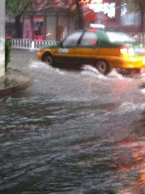 虎坊路一带已成河流,这真是坐车过河。排水系统怎么了?